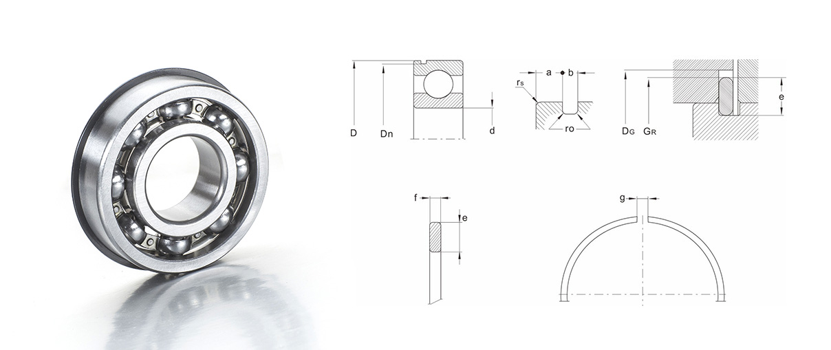 Modmilo | Modelos básicos Serie de rodamientos | D | Dn | a 60 | a Serie de rodamientos 62 63 64 | b | r0 | Anillo de parada | F | e | gramo | DR | Director General | |||||||||